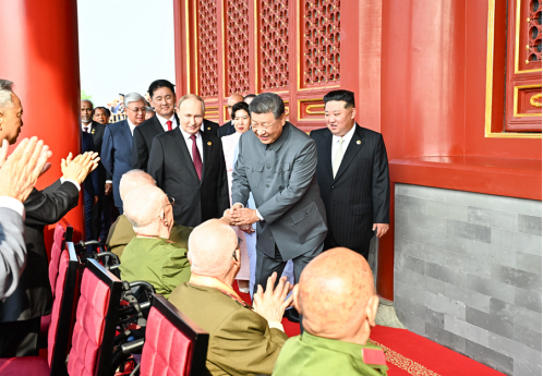 9月3日,纪念中国人民抗日战争暨世界反法西斯战争胜利80周年大会在北京天安门广场隆重举行。这是大会开始前,中共中央总书记、国家主席、中央军委主席习近平同抗战老战士老同志代表亲切握手,向他们表示崇高敬意。新华社记者 燕雁 摄