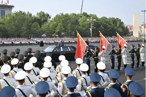 8时55分,习近平等中外领导人来到天安门城楼主席台,全场爆发出雷鸣般的掌声。